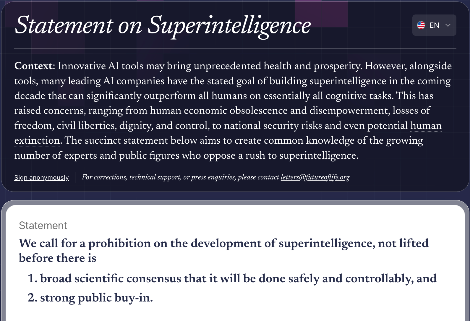 More recently the letter has been amended to reflect the severity of the tipping point we find ourselves at, with prominent voices in the AI community such as Geoffrey Hinton and Stuart Russell actively attempting to raise public awareness. Instead of calling for a six-month pause, the letter now forcefully and explicitly calls for prohibition on the development of superintelligence, not lifted before there is: